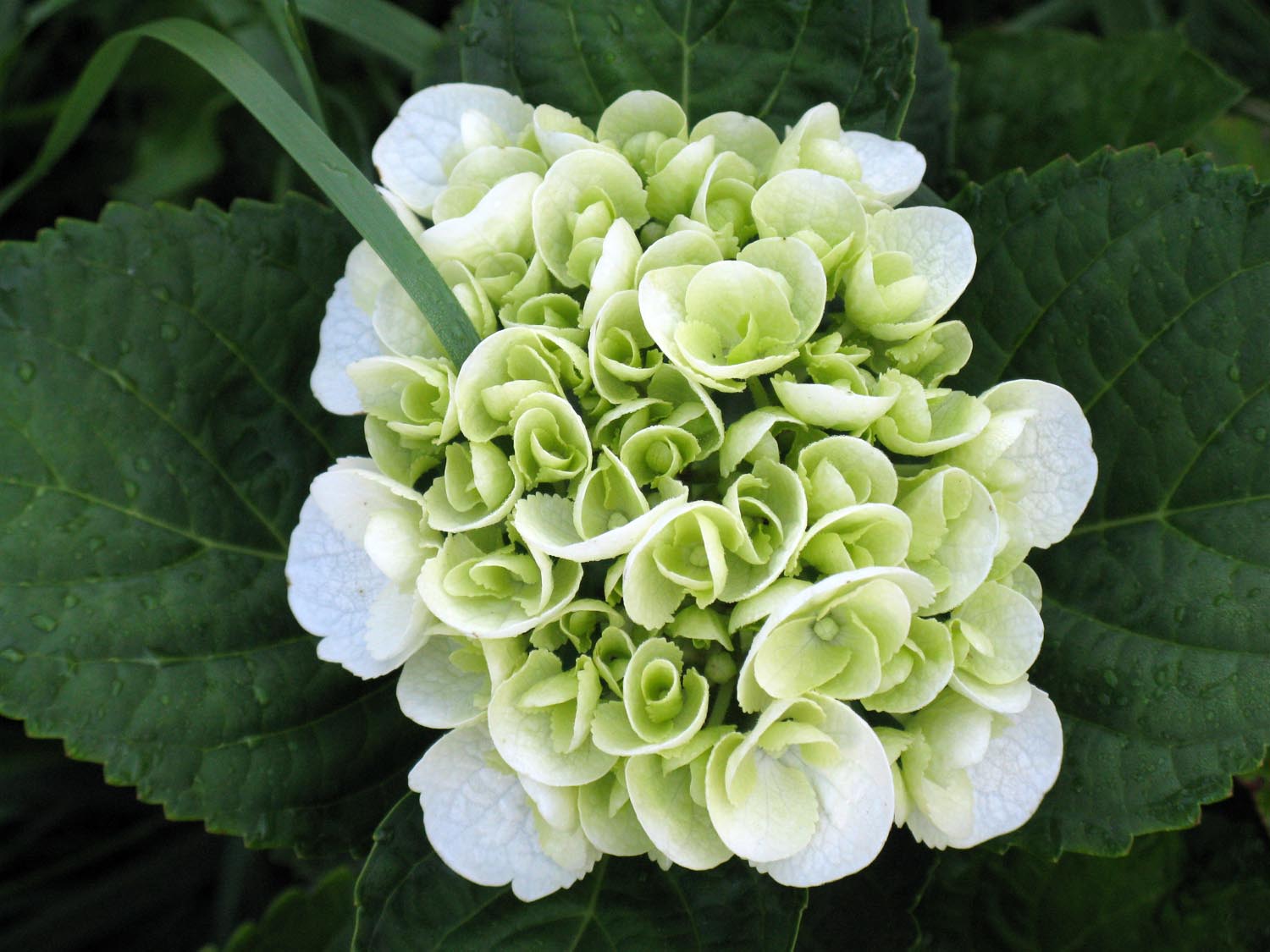 When we got to the checkout with our flowers the cashier offered us one of several herbs that were not in great shape, the hydrangea was sitting in the middle of it with the purply/blue that I love about them. We asked about the hydrangea and she said that would be fine. So looking very sad and having a few flies we brought it home & my sweetie planted it right in the middle of the lawn. My sweetie has a way with plants and with a little effort he’s brought the hydrangea back to good health. Such good health in fact it’s blooming. And it’s blooming beautifully.